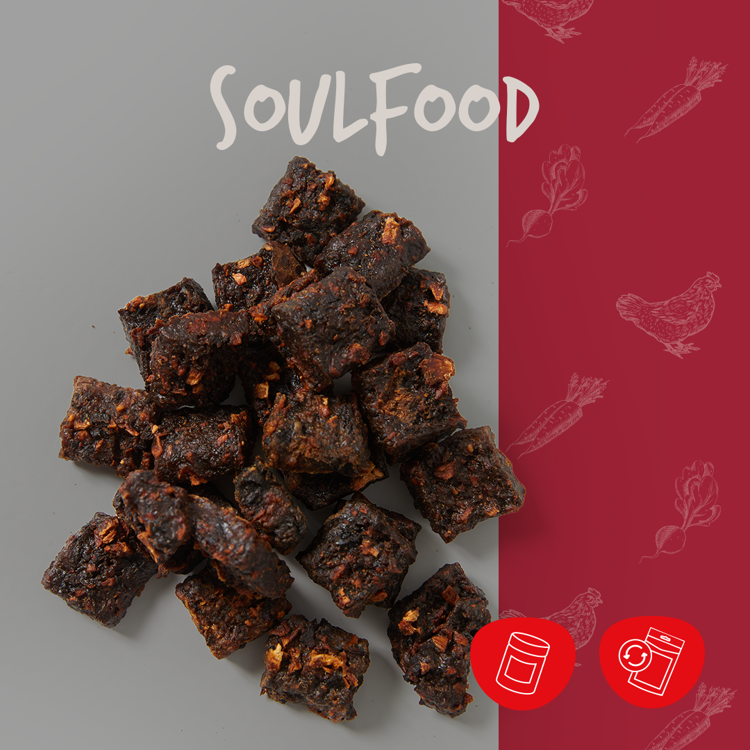 cadocare Hundeleckerlies, schenke Deinem Hund ein Stückchen Liebe! Unser SOULFOOD ist der kleine Energieschub für Zwischendurch und Balsam für die Hundeseele. SOULFOOD Snacks sind schonend luftgetrocknete Fleischsnacks, die durch die Zugabe von Kräutern, Gemüse und/oder Beeren der natürlichen Ernährung des Wolfes nachempfunden wurden. Mit diesem Plus an Geschmack, Optik und ansprechendem Geruch sind sie für Hunde aller Altersklassen und Rassen geeignet und überzeugen sogar Frauchen und Herrchen.