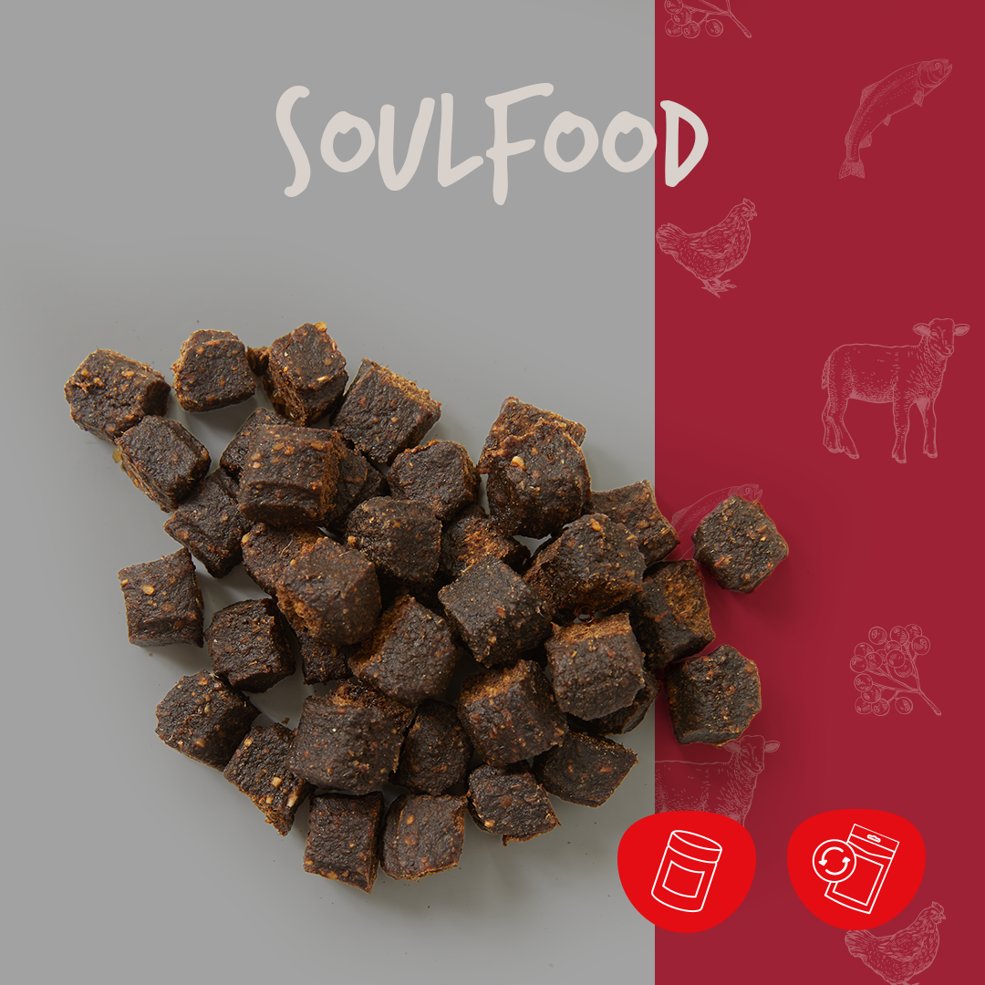 cadocare Hundeleckerlies, schenke Deinem Hund ein Stückchen Liebe! Unser SOULFOOD ist der kleine Energieschub für Zwischendurch und Balsam für die Hundeseele. SOULFOOD Snacks sind schonend luftgetrocknete Fleischsnacks, die durch die Zugabe von Kräutern, Gemüse und/oder Beeren der natürlichen Ernährung des Wolfes nachempfunden wurden. Mit diesem Plus an Geschmack, Optik und ansprechendem Geruch sind sie für Hunde aller Altersklassen und Rassen geeignet und überzeugen sogar Frauchen und Herrchen.